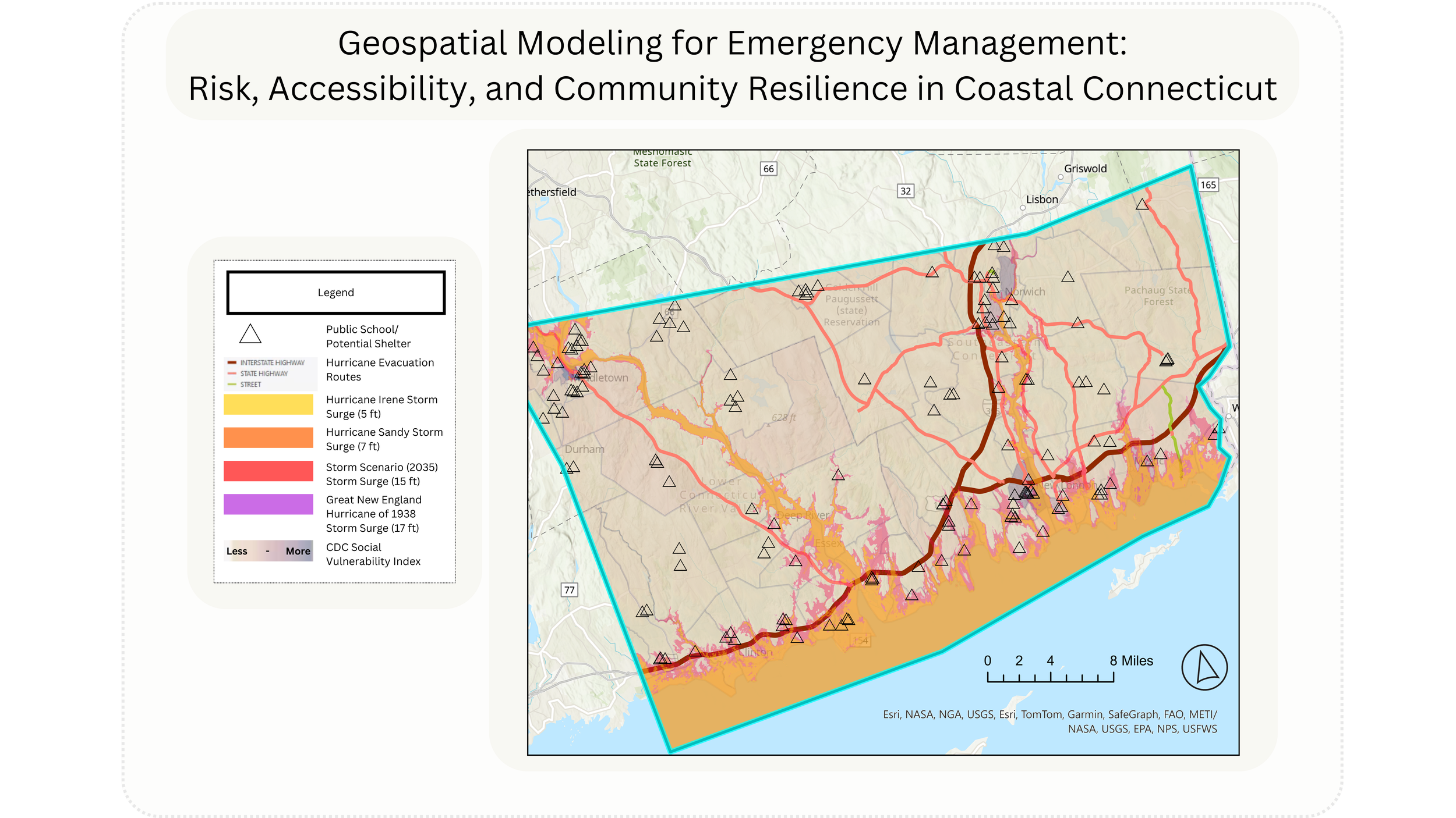 This project employs geospatial modeling to evaluate the storm surge impacts of three historical hurricanes, as well as a projected future storm, on Connecticut’s coastal communities. The events examined include the Great New England Hurricane of 1938, Hurricane Irene (2011), Hurricane Sandy (2012), and a future hypothetical storm scenario anticipated for 2035. Using publicly available data and GIS tools, I overlaid historical and potential future storm surges with critical infrastructure, commercial zones, and population density to quantify past and future risk exposure. Network analysis was applied to evaluate the spatial accessibility and coverage of designated emergency shelters and evacuation routes. The project integrates an interactive, story-based mapping component to visualize historical evacuation patterns and shelter responses, highlighting areas for potential policy improvement. In addition to spatial analysis, the project explores opportunities for public engagement by considering a survey feature to gather community input on past shelter experiences and accessibility challenges. The final deliverable aims to inform local emergency management strategies, enhance community preparedness, and contribute to ongoing policy discussions surrounding coastal resilience.